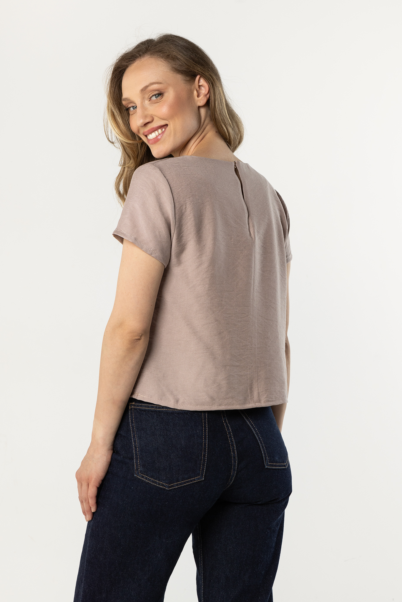 Lekka bluzka o prostym, swobodnym kroju to uniwersalny element garderoby, który świetnie sprawdzi się w codziennych stylizacjach. Półokrągły dekolt subtelnie podkreśla szyję, a krótkie rękawy zapewniają komfort i lekkość noszenia. Luźniejszy fason miękko układa się na sylwetce, gwarantując wygodę przez cały dzień. Gładka tkanina o delikatnie satynowym wykończeniu dodaje całości eleganckiego charakteru, dzięki czemu bluzka doskonale pasuje zarówno do jeansów, jak i bardziej klasycznych spodni czy spódnicy.