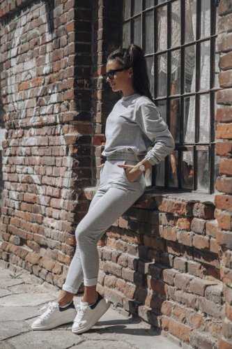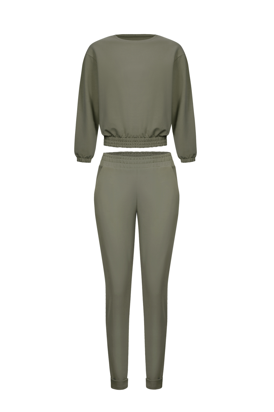 Swobodny komplet dresowy w kolorze khaki. Bluza z długimi rękawami wykończonymi gumkami. Spodnie typu slim z kieszeniami podkreślą kobiecą figurę. Długość nogawki można regulować. Spodnie i bluza z szeroką gumką. Sprawdzi się w bardziej luźnych stylizacjach.