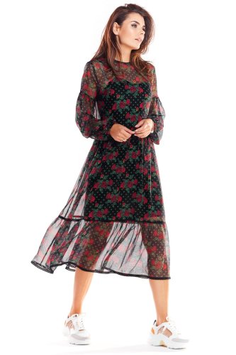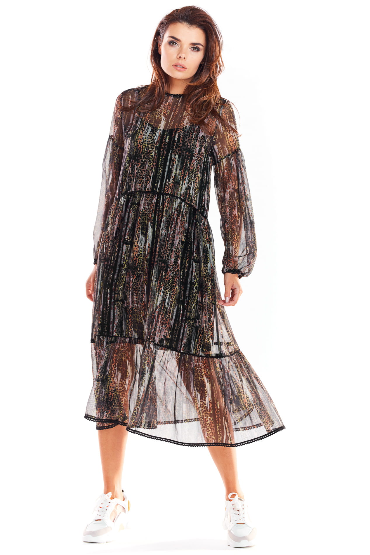 Długa, dwuwarstwowa sukienka Brązowy wzór AW316