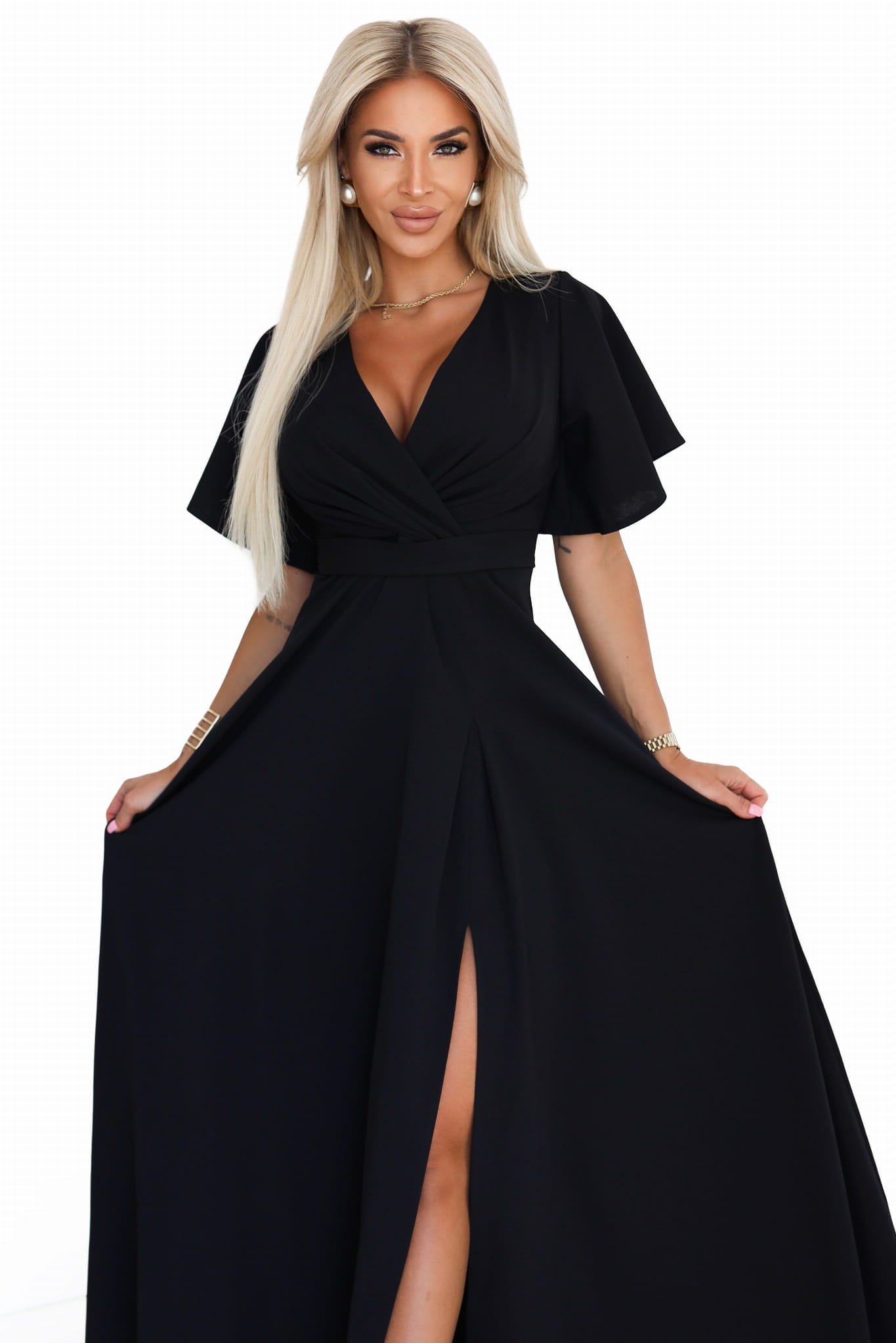 Elegancka czarna suknia maxi z kopertowym dekoltem