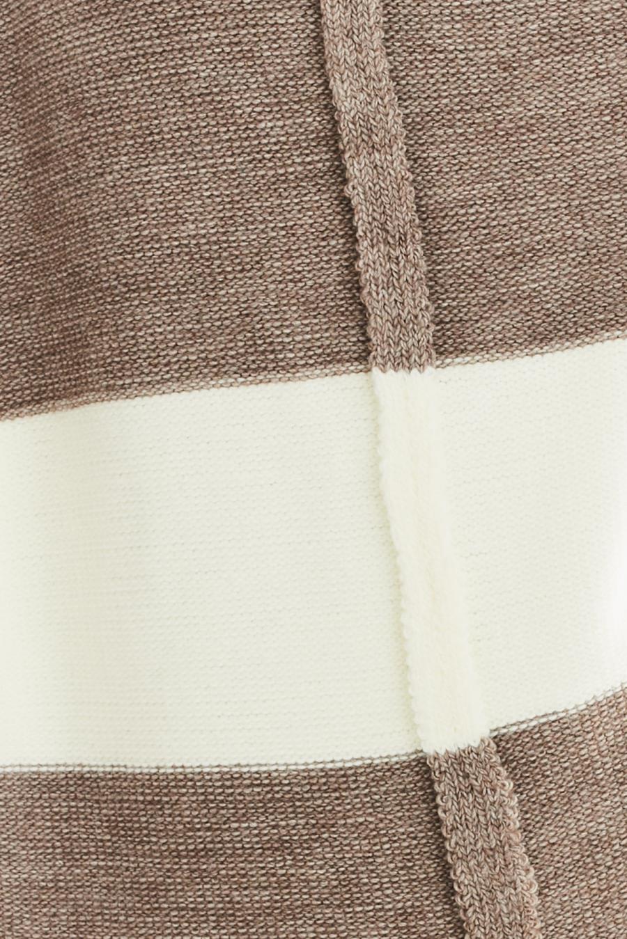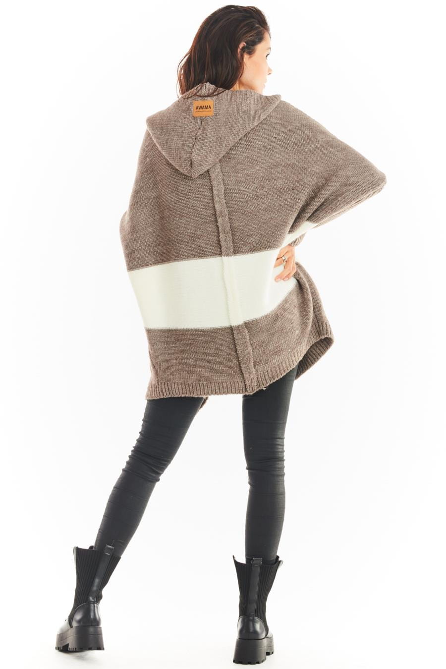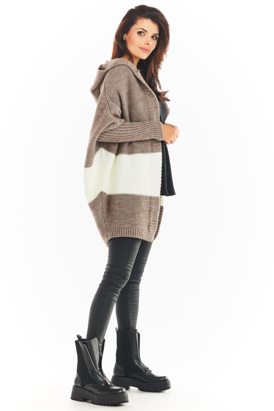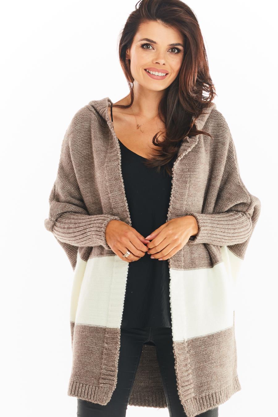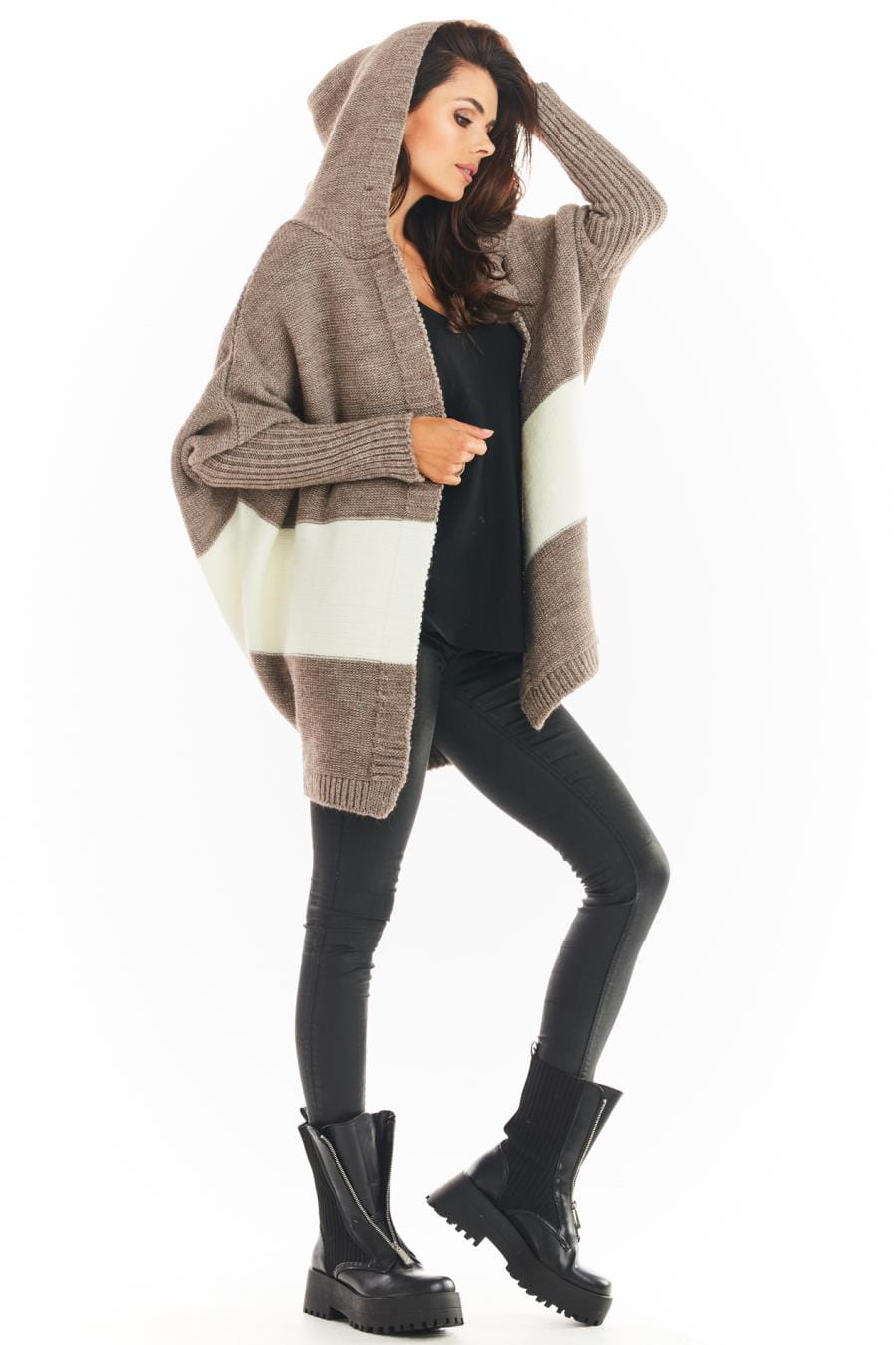 Ciepły kardigan z kapturem w kolorze beżowym. Kardigan z długim rękawem, bez zapięcia. Przez środek przechodzi pas w innym kolorze. Sprawdzi się w chłodne dni i wieczory. Idealna propozycja do codziennych stylizacji.