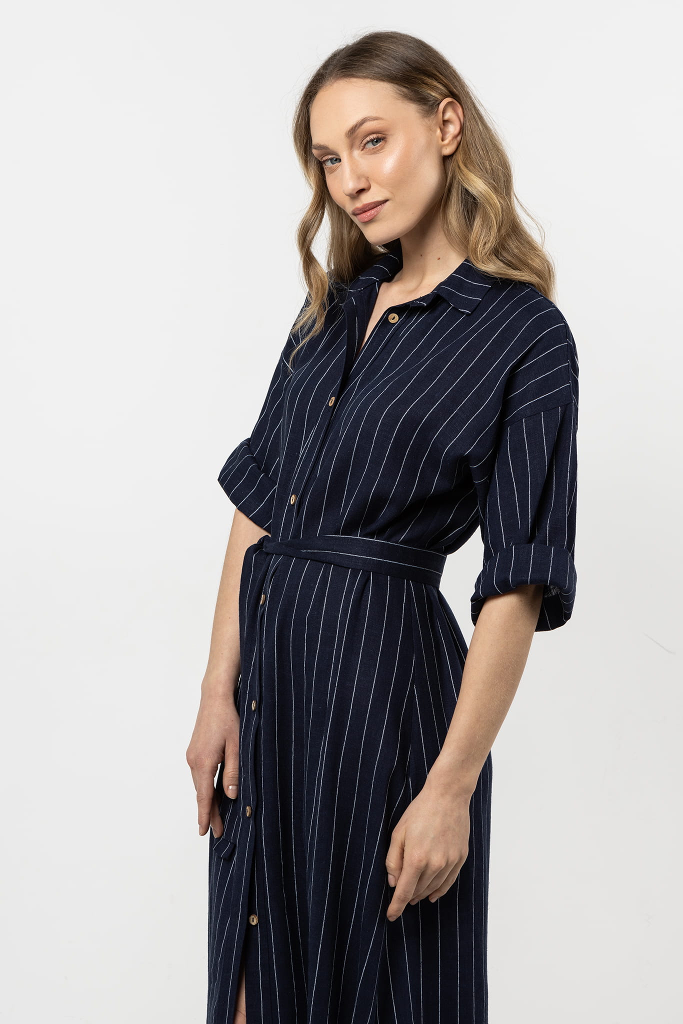 Lniana sukienka szmizjerka w delikatne prążki Granatowa