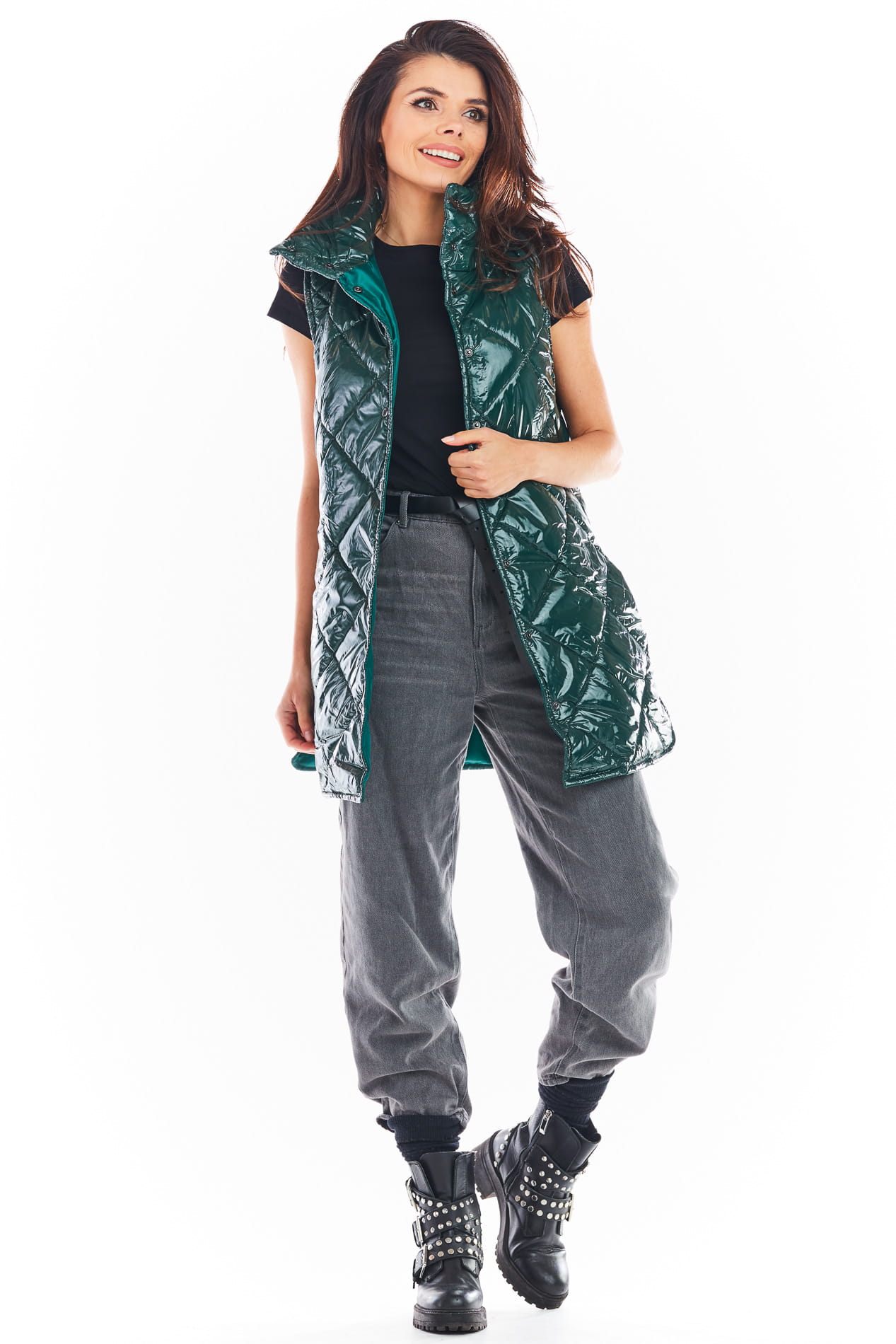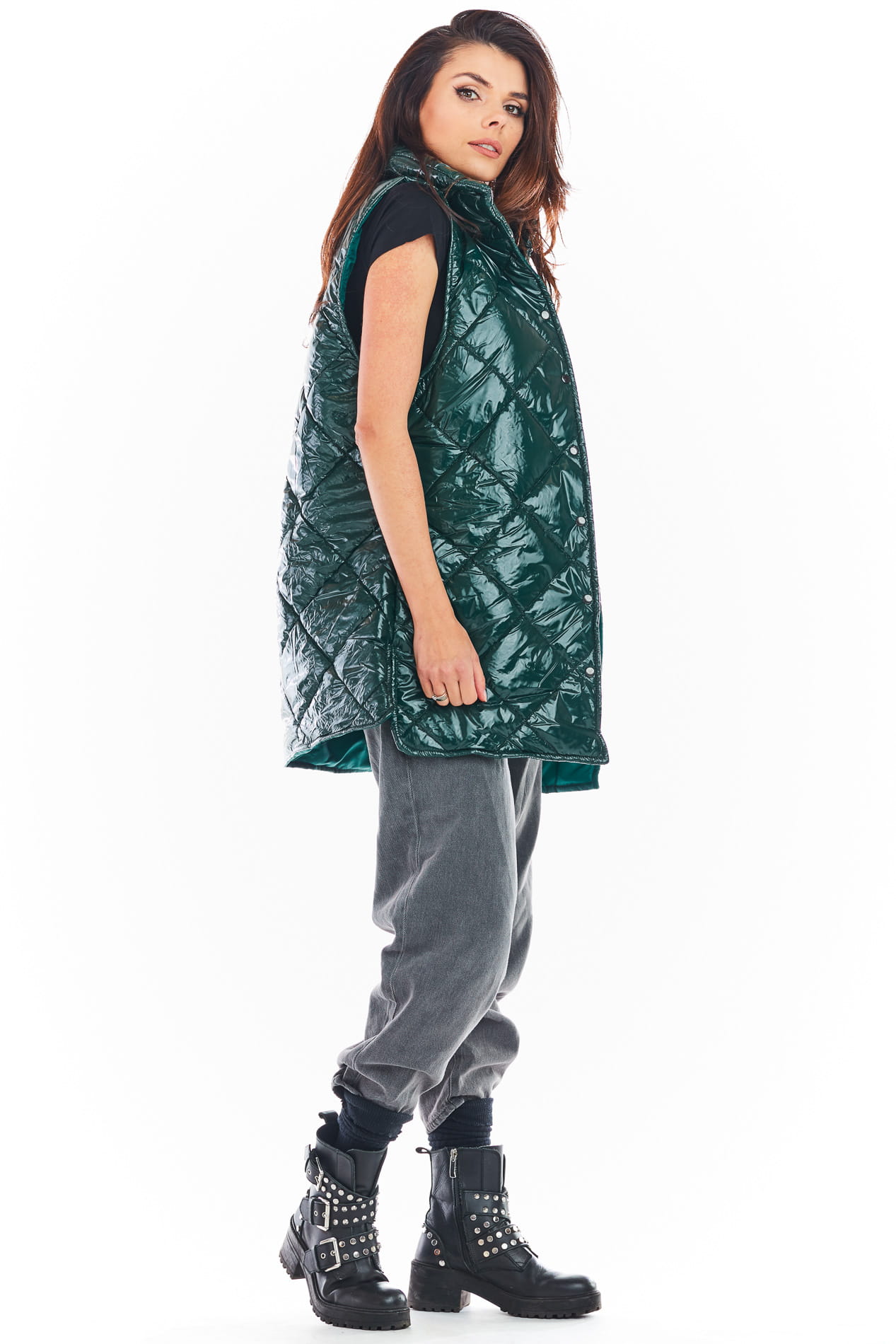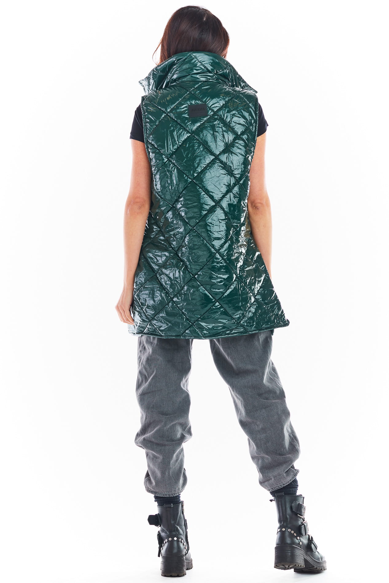 Pikowana, ciepła kamizelka z wysokim kołnierzem, zapinana na napy.