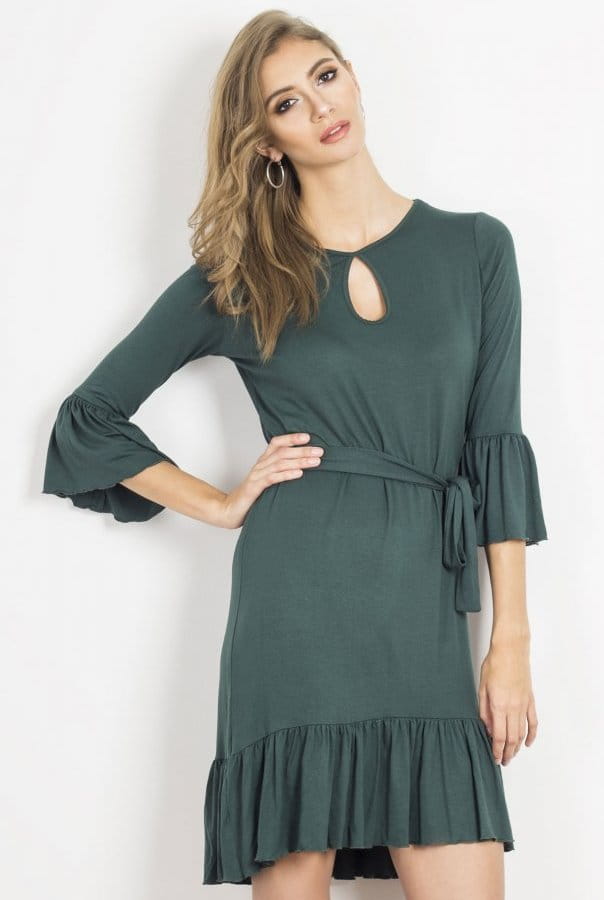 - Sukienka o luźnym kroju z falbankami przy rękawach oraz na dole, wykonana z przyjemnej w dotyku wiskozy - Rękaw 3/4 - Okrągły dekolt z efektowną łezką - Pasek w talii z możliwością związania w dowolny sposób - Maksymalna temperatura prania 30 st. C , prasować w niskiej temperaturze - Modelka ma 180 cm wzrostu i ma na sobie rozmiar 36