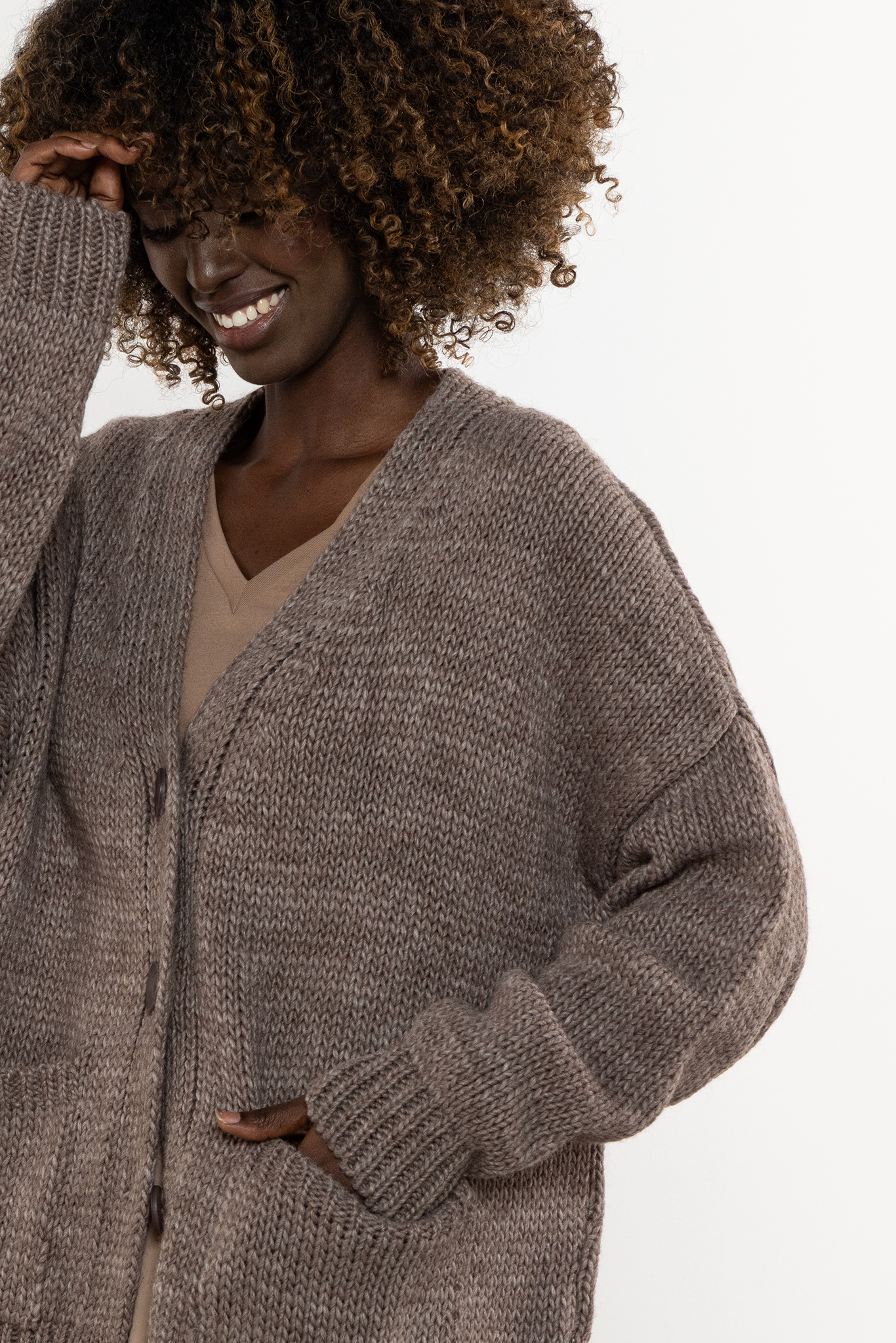 Propozycja dla kobiet ceniących prostotę, miękkość i funkcjonalność. Uszyty w Polsce z dbałością o detale. Basicowy krój z dekoltem V, zapięciem na guziki i kieszeniami płynnie przechodzi między casualem a smart casualem. Miękka dzianina z dodatkiem wełny otula i grzeje w sezonie jesień–zima.