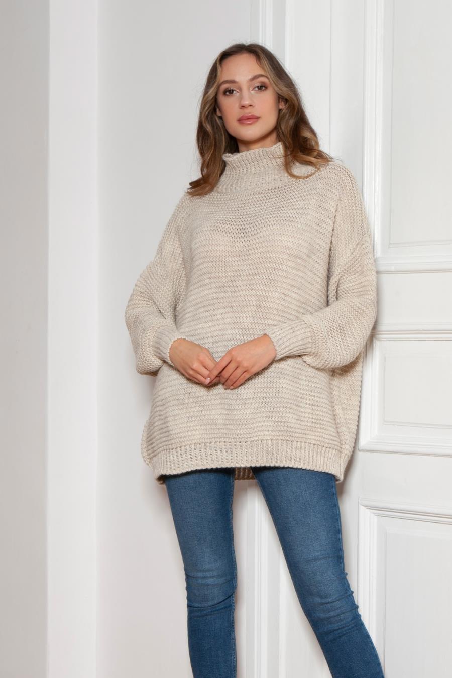 Sprężysty sweter z golfem w kolorze beżowym. Sweterek z długimi rękawami zakończonymi ściągaczami. Idealna propozycja na co dzień w chłodniejsze dni. Mimo obszernego fasonu mieści się pod kurtkę lub płaszcz.